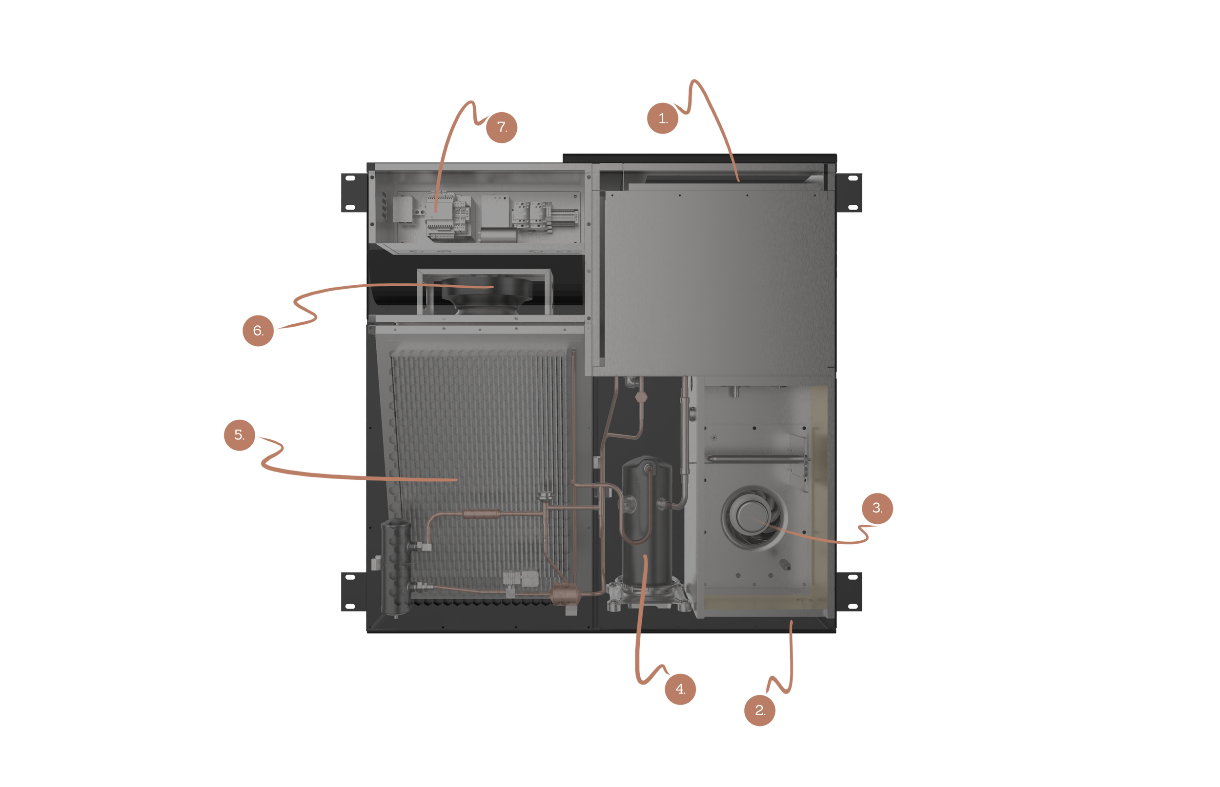 Hot humid air is pulled from the top of the unit, through the filter and evaporator coils and back into the grow area. Condensate is captured and returned into the cultivation tank