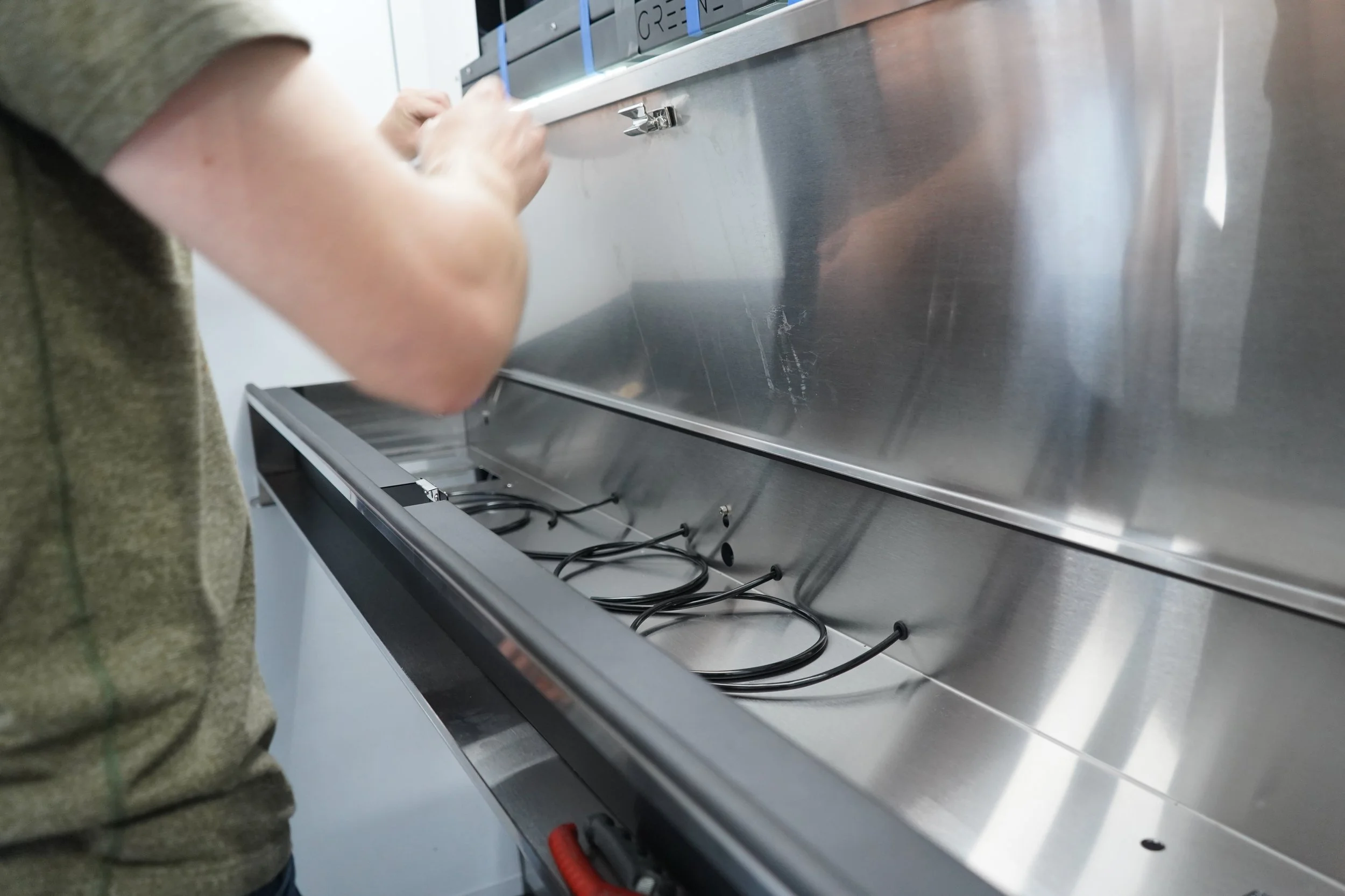 Tucked away until needed, the Garden™ offers easy access to every necessary touch point. Control modules are serviced behind a hinged access panel. The nutrient tanks slide inside the table to maximize volume and usability. Easily detached with a quick-connect fitting, the tanks are fully removable for filling and cleaning.