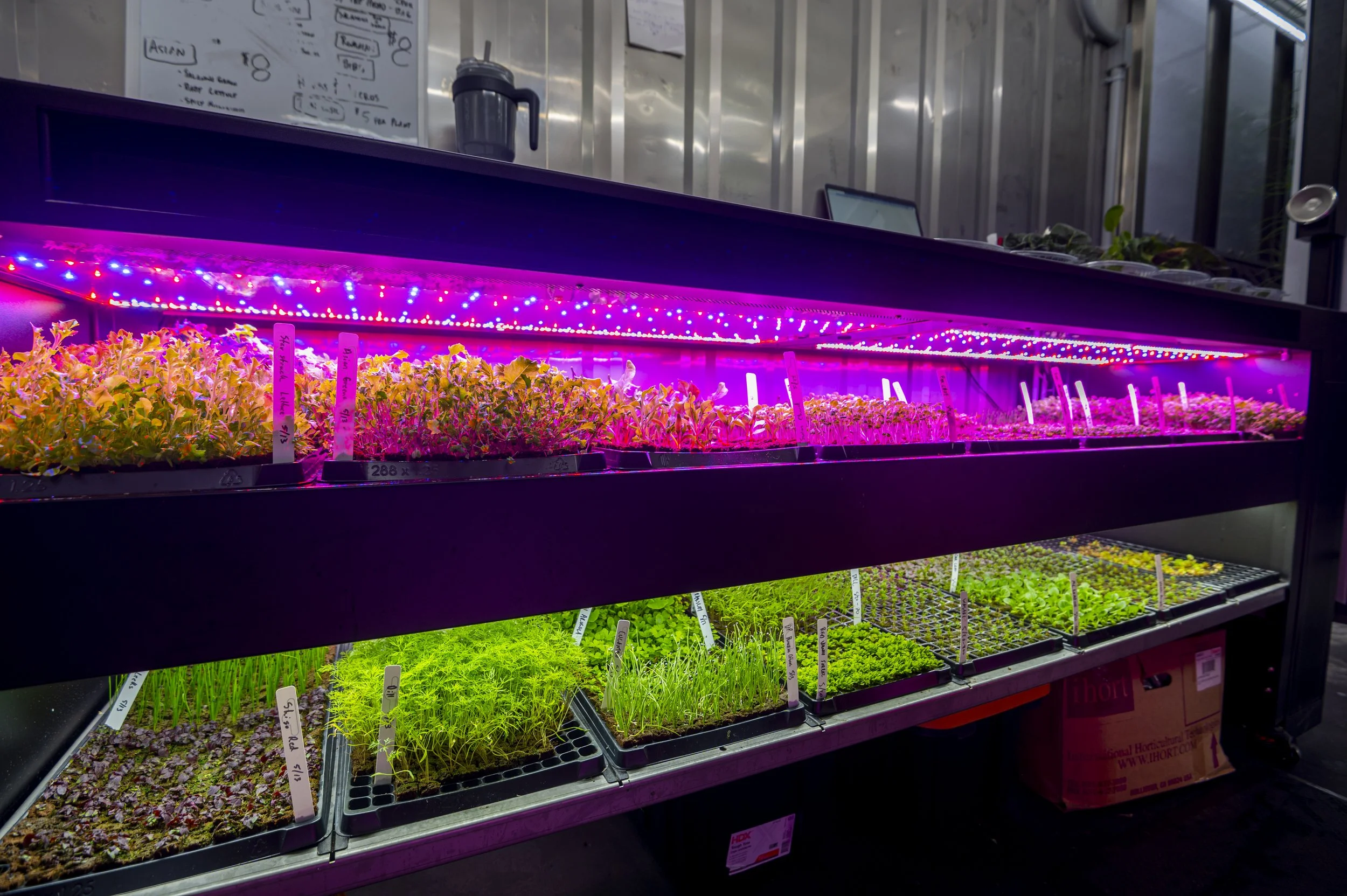 Seedling troughs are fed with nutrient-rich water, tailored to the plants’ needs. The system automatically monitors and adjusts nutrient levels, dosing as needed. Water flows past the roots and is recirculated back to the reservoir, which is kept full with an automated refill system.
